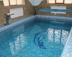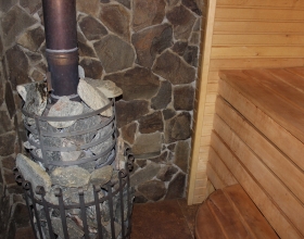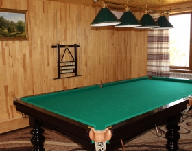 У великому будинку на першому поверсі розташована вітальня з сауною та басейном, який підігрівається. Після теплих процедур у сауні із запахом натурального дерева, Ви можете поринути в контрастний басейн, що добавить до Вашого відпочинку екстриму. У вітальні за столиком на зручних шкіряних диванах та кріслі є можливість прийняти охолоджуючі напої з їжею або просто пограти настільні ігри.